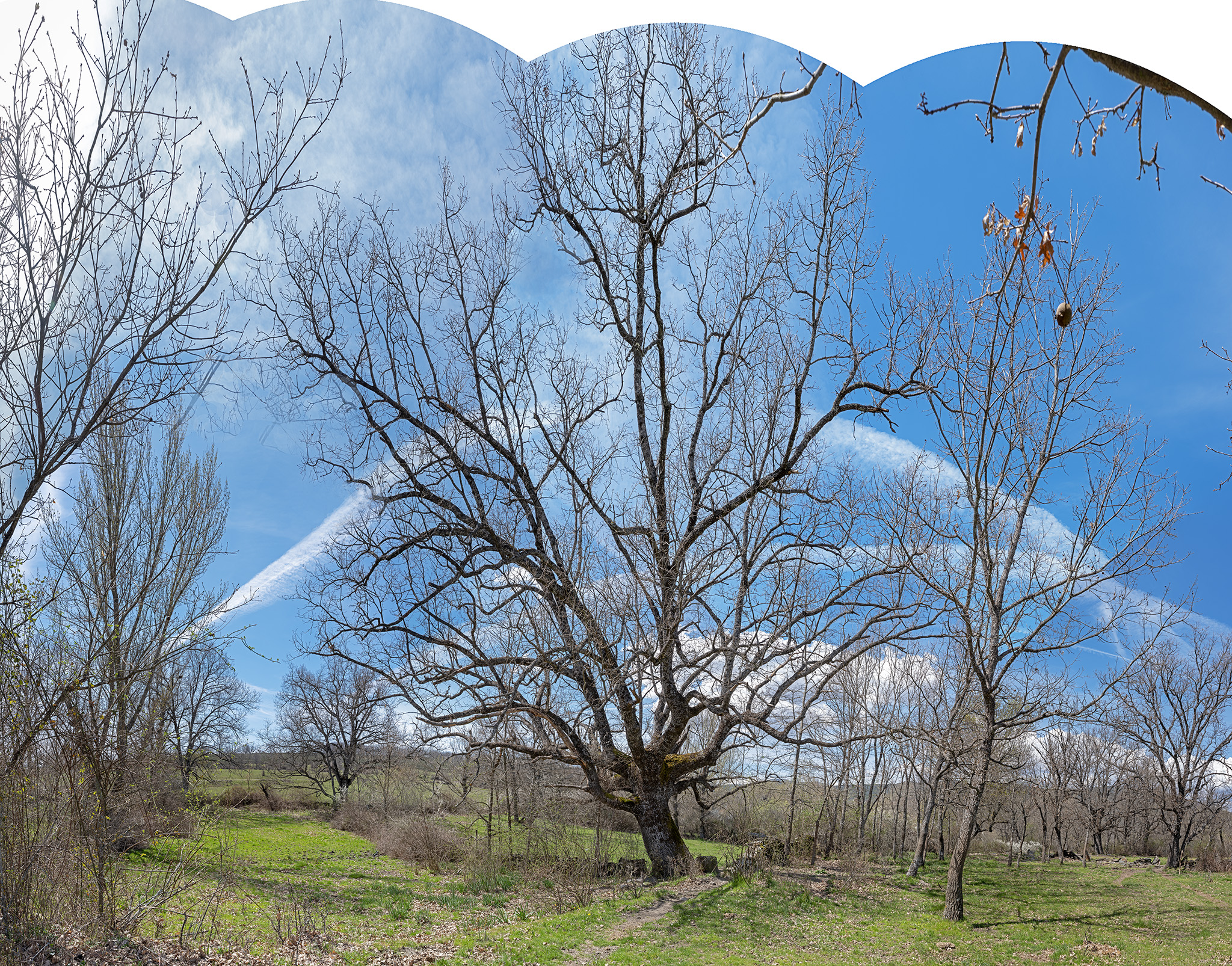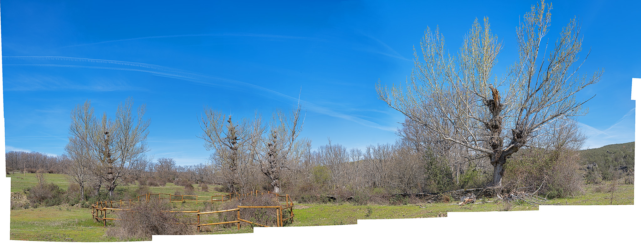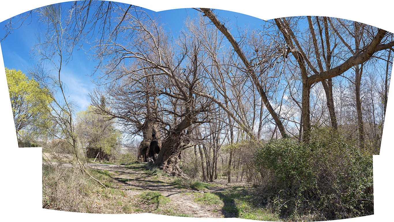 Otro ejemplo, esta foto, paisaje con árboles, álamos y una morera, tomada en Labuerda, Huesca, y que el original tiene 20×7,4 Kpx, suficiente para llenar la mayoría de paredes, o esta otra, tomada cerca de Cedrillas, en el peirón de Aguanaj, con su chopo cabecero, digna muestra de la llamada “España vaciada”, cuyo original son 28×14 Kpx y donde se aprecia que se trata de un mosaico compuesto por una docena de fotos.