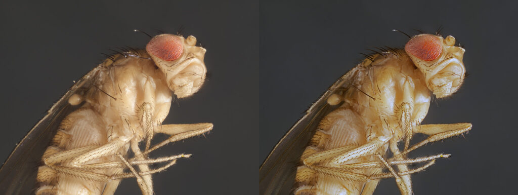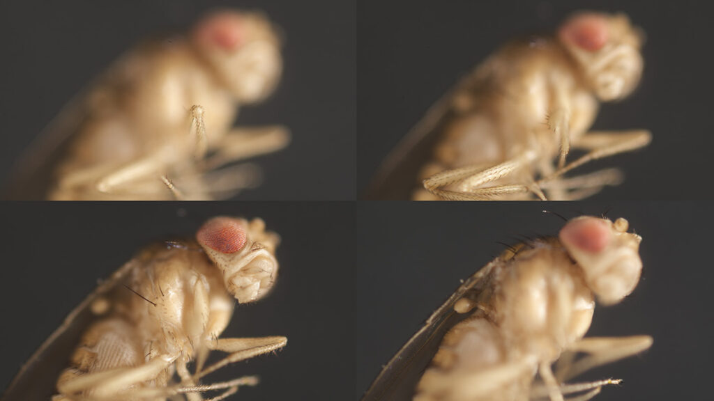 Entonces volvamos a nuestra Drosophila. Hacer una toma con este nivel de definición no consiste en un “clic”. Para los fotógrafos de macro no hace falta explicar mucho, para quien no tiene experiencia si que habrá que hacerlo.