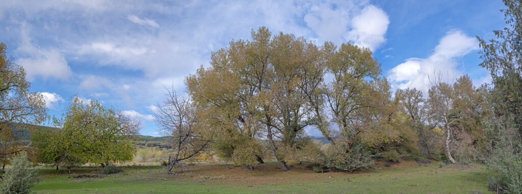 Otro ejemplo, esta foto, paisaje con árboles, álamos y una morera, tomada en Labuerda, Huesca, y que el original tiene 20×7,4 Kpx, suficiente para llenar la mayoría de paredes, o esta otra, tomada cerca de Cedrillas, en el peirón de Aguanaj, con su chopo cabecero, digna muestra de la llamada “España vaciada”, cuyo original son 28×14 Kpx y donde se aprecia que se trata de un mosaico compuesto por una docena de fotos.