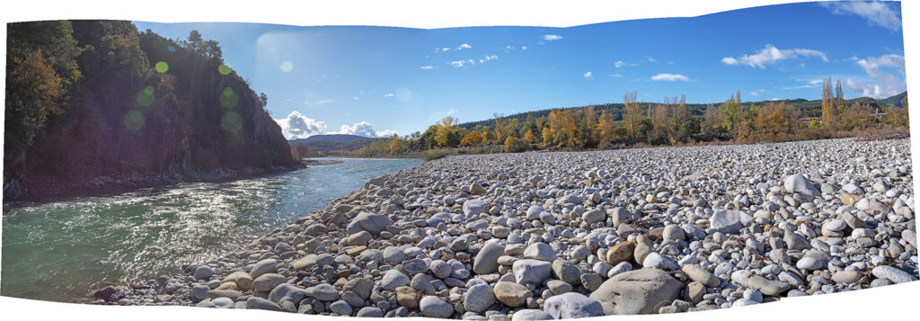 O este otro paisaje, el cauce del río Cinca en Labuerda, Huesca, en el que se intuye un mosaico de 6 tomas y que tiene 23×8 Kpx, otro panorama para llenar paredes.